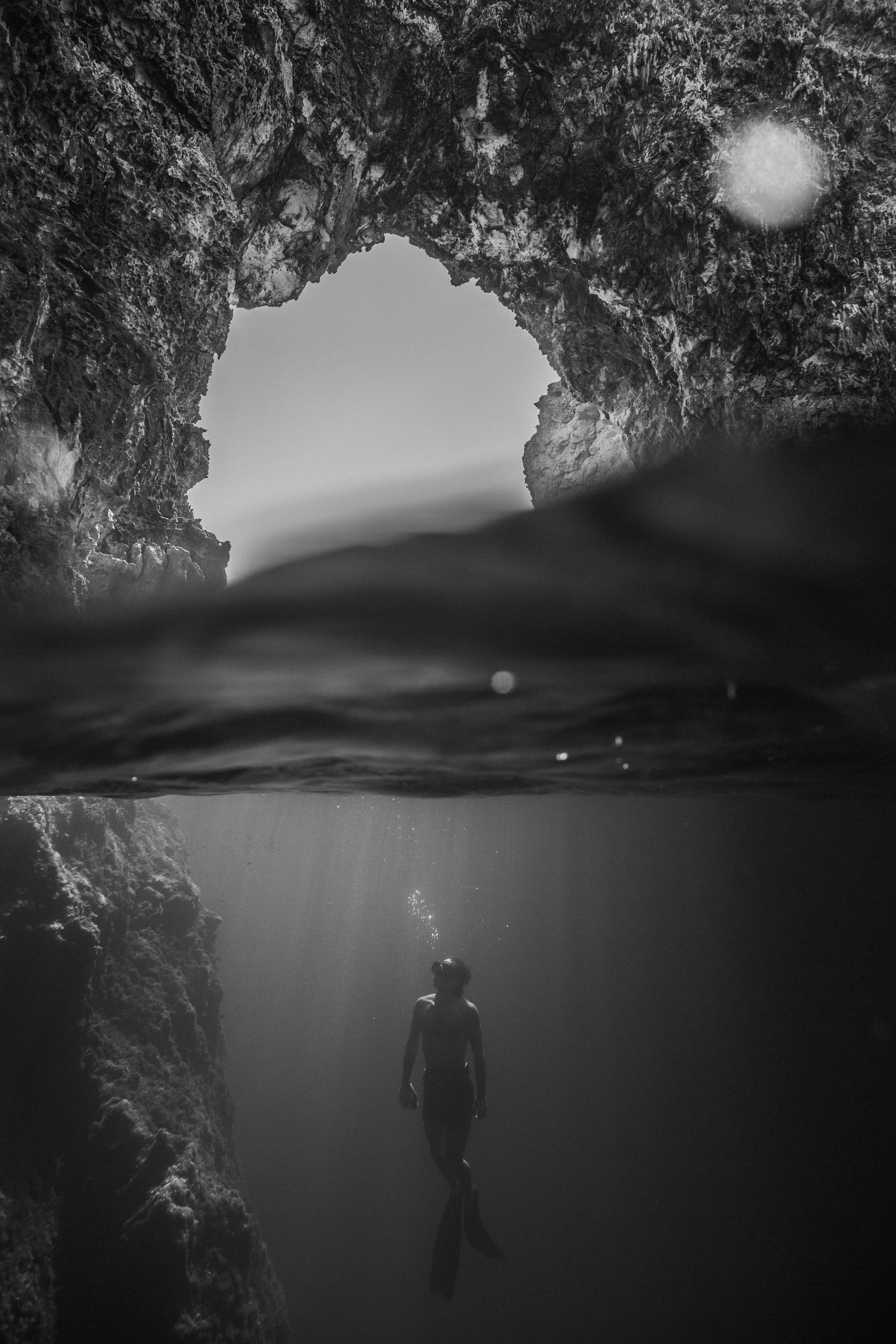 Some caves open below the surface and lead into vast chambers filled with blue light and reflections. These are places that almost no one ever sees, except freedivers.